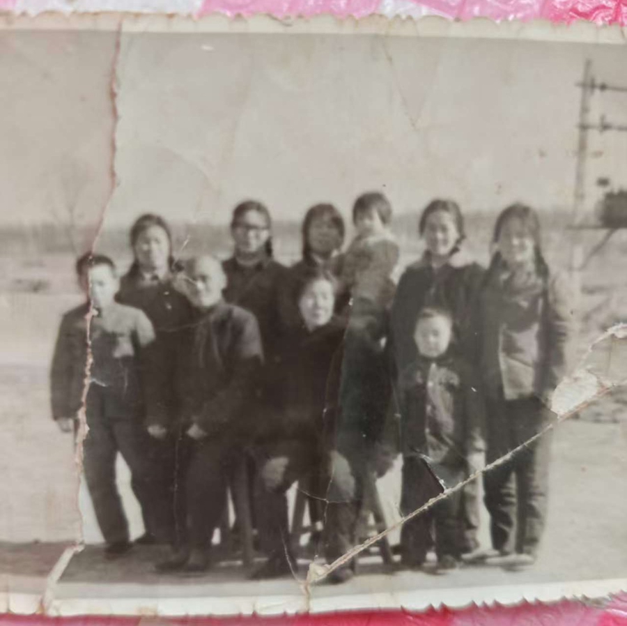 老两口和孩子们在一起。老照片几经辗转,破损不堪,但子女依旧保存着