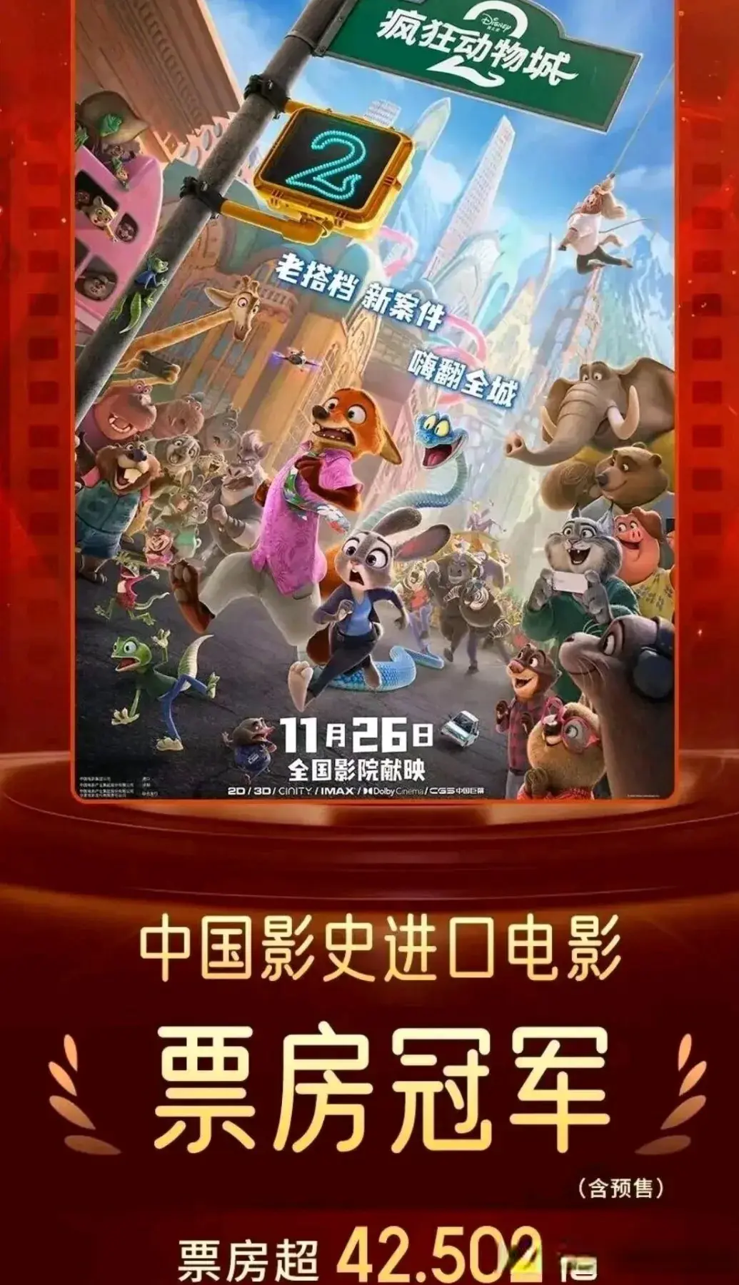 除了《哪吒2》创造票房奇迹,断层式位列内地影史总票房榜第一位,还在院线上映的《疯狂动物城2》,已经成为中国影史进口电影票房冠军。