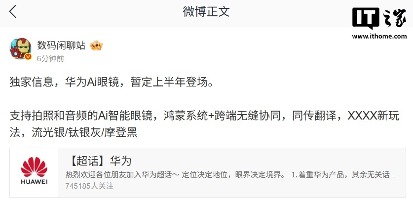IT之家 1 月 25 日消息,博主 @数码闲聊站 此前爆料称,华为 AI 眼镜暂定上半年登场,支持拍照和音频,鸿蒙系统 + 跨端无缝协同,同传翻译,XXXX 新玩法,流光银 / 钛银灰 / 摩登黑。
